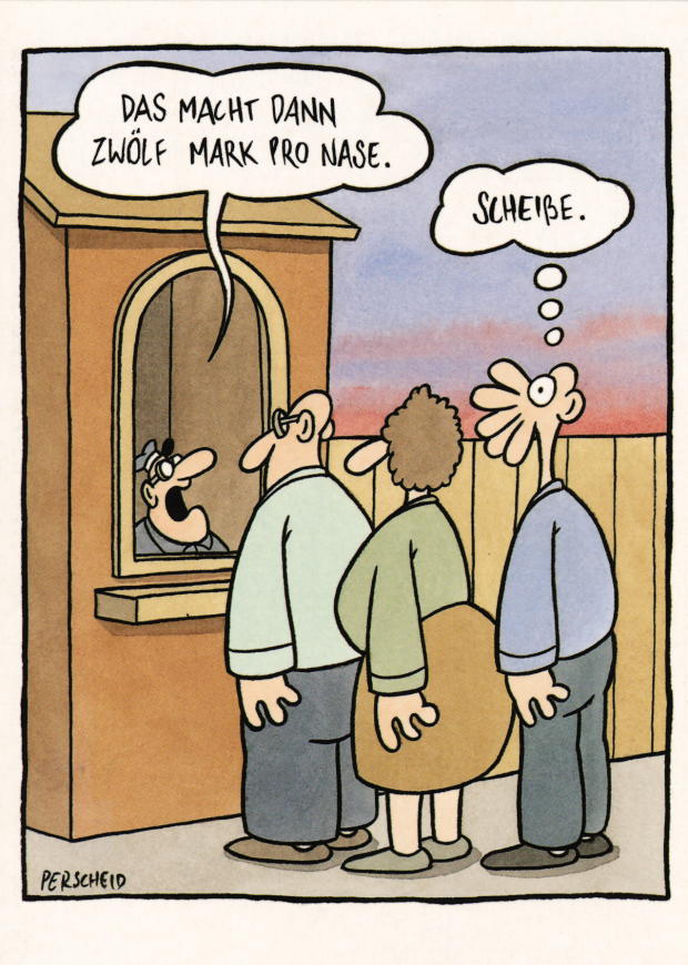 Drei Leute warten an einem Kiosk, der Verkäufer sagt, dass es zwölf Mark pro Person kosten wird, was sie überrascht. Die Stimmung scheint humorvoll.