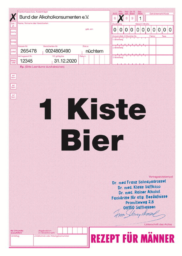 Auf einem rosa Rezeptblock ist eine Bestellung für einen Kasten Bier vermerkt. Das Ausstellungsdatum ist der 31. Dezember 2020, der Ort ist in Sulzhausen.