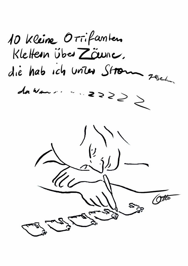 Ein Künstler skizziert seine Gedanken über kleine Ottifanten, die über Zäune klettern. Er konzentriert sich auf das Zeichnen, während er in seiner kreativen Umgebung sitzt.