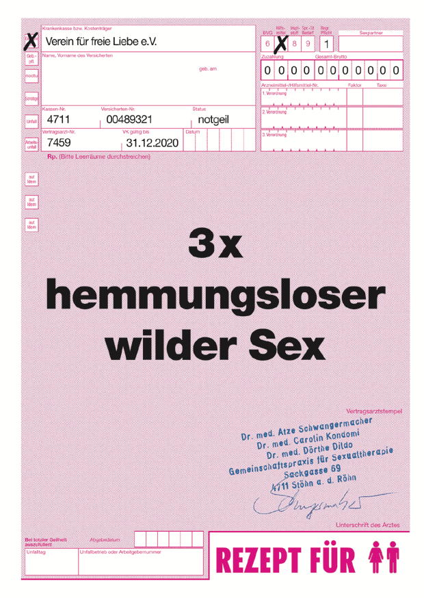 Ein Rezept von einem Verein für freie Liebe, das drei Einheiten hemmungslosen wilden Sexes anordnet. Es stammt aus Deutschland und ist datiert auf Ende 2020.