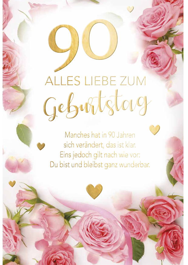 Diese Glückwunschkarte zum 90. Geburtstag zeigt liebevolle rosa Rosen und elegante goldene Details, die einen festlichen Anlass ansprechend umrahmen.
