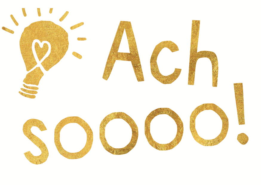 Eine goldene Schrift mit der Botschaft Ach sooooo wird von einer symbolischen Glühbirne begleitet, die Inspiration und Ideenverkörperung suggeriert.