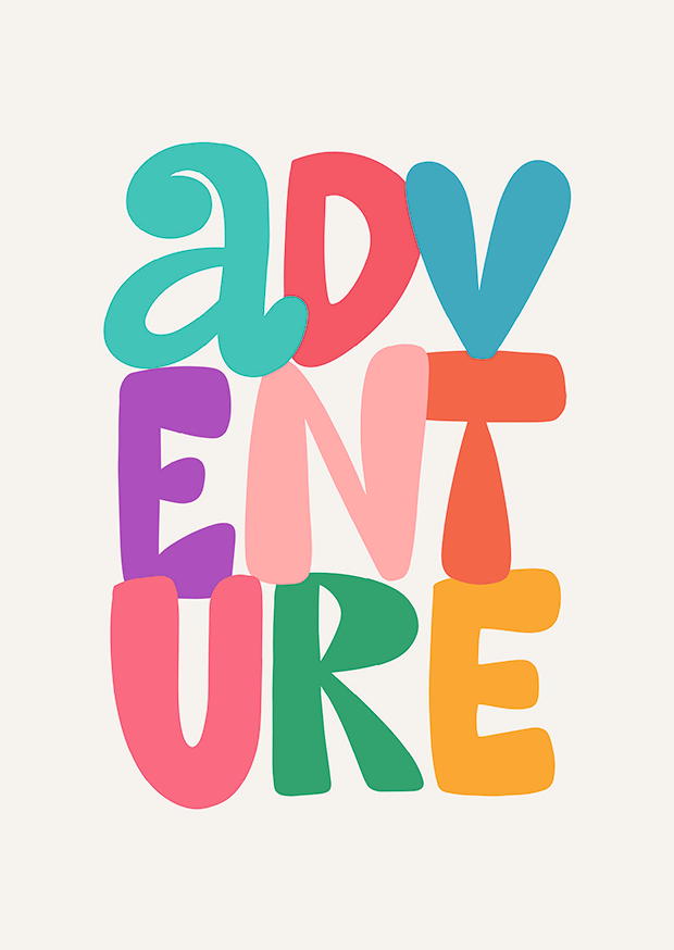 Auf einem hellen Hintergrund sind die Buchstaben des Wortes Abenteuer in verschiedenen Farben und Schriftarten angeordnet. Die Komposition vermittelt Freude und Entdeckungslust.