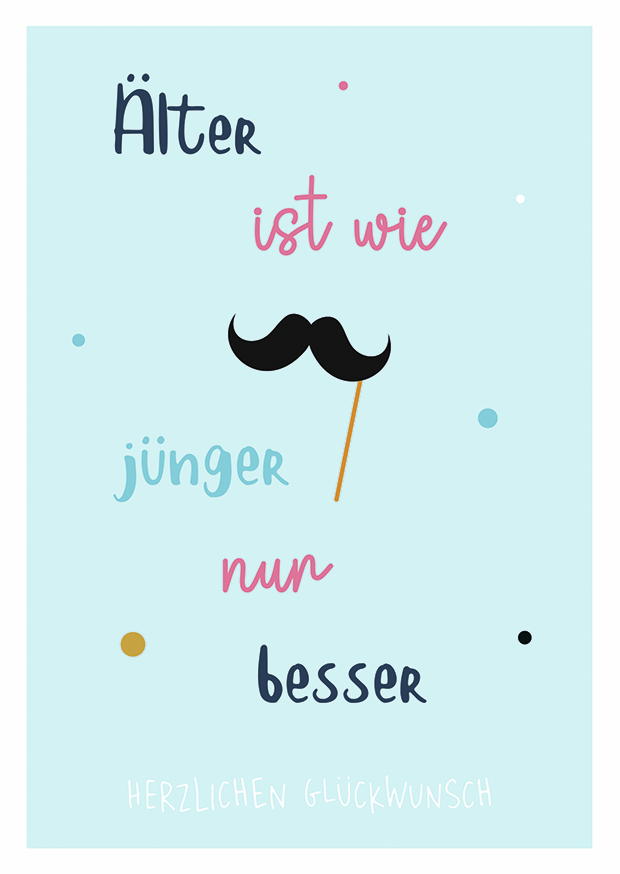 Die Karte zeigt einen humorvollen Spruch, der das Älterwerden positiv betrachtet. Sie ist in sanften Farben gestaltet und trägt auch einen stilisierten Schnurrbart.