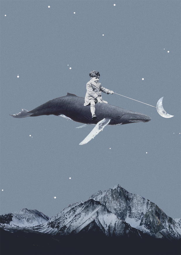 Ein kleiner Junge sitzt auf dem Rücken eines Wals und hält eine Schnur mit einem Mond in der Hand, während er majestätisch durch den nächtlichen Himmel gleitet.
