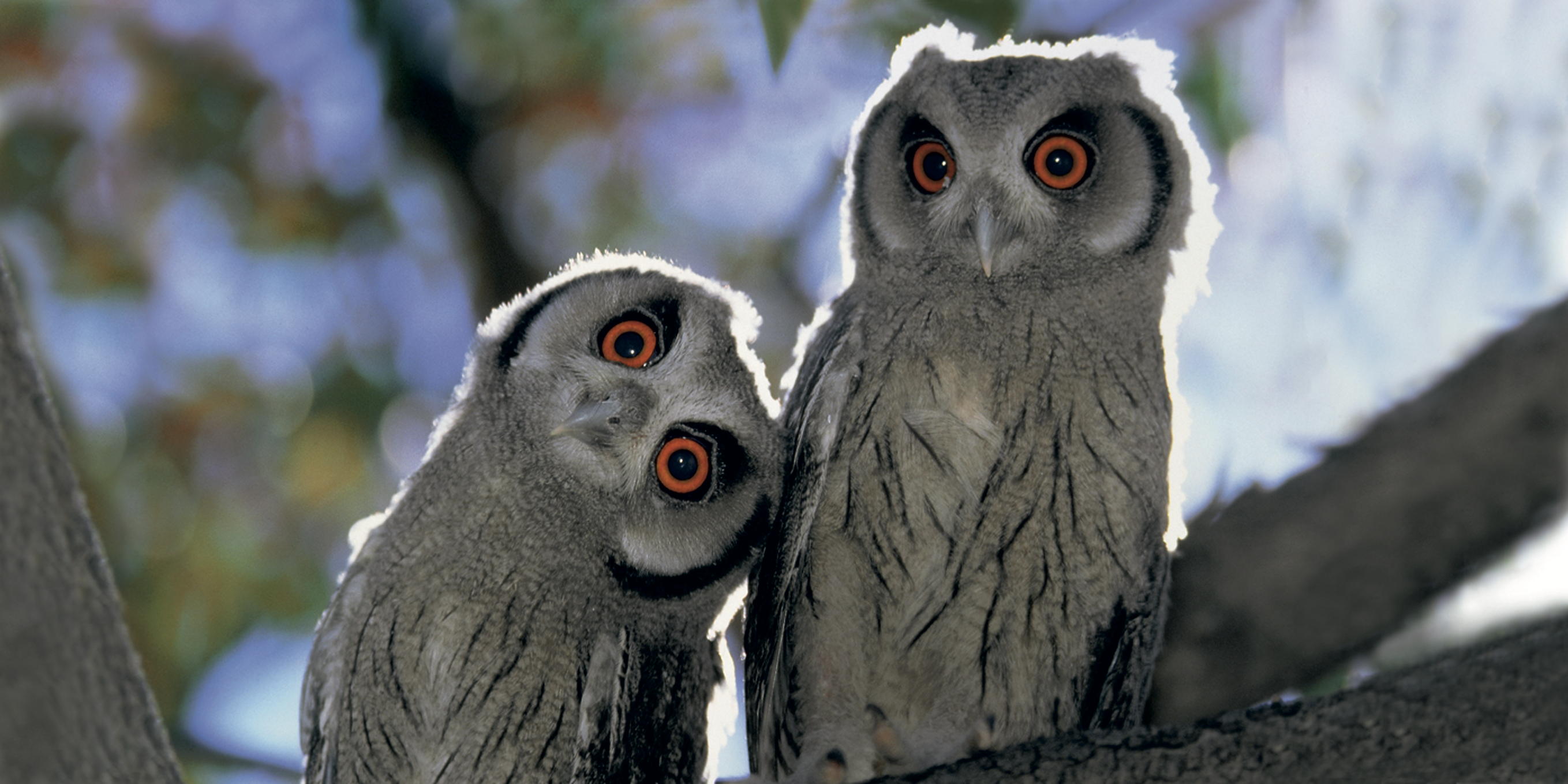 Zwei Eulen sitzen dicht beieinander auf einem Ast eines Baumes, ihre großen, runden Augen blitzen im Sonnenlicht, während sie die Umgebung aufmerksam beobachten.