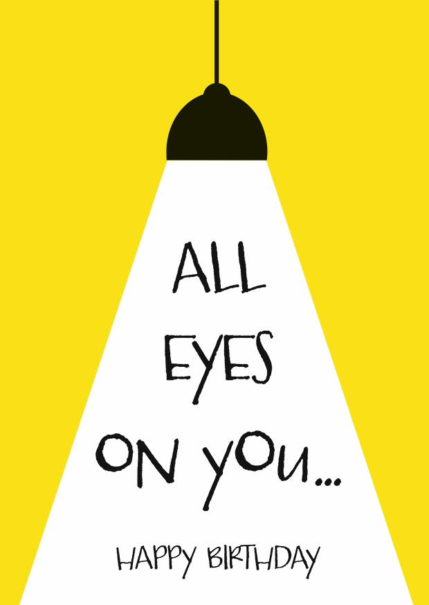 Ein kreatives Geburtstagsmotiv mit gelbem Hintergrund und einem Scheinwerfer, der den Fokus auf die Worte „All eyes on you… Happy Birthday“ lenkt.