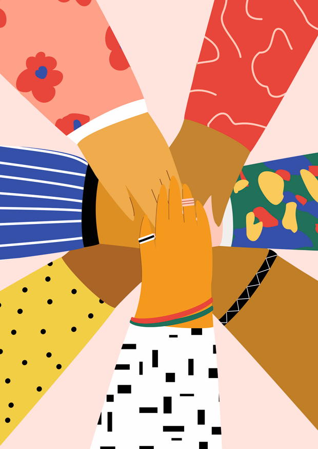 Hände unterschiedlicher Personen in bunten Outfits vereinen sich in der Mitte, was ein Gefühl von Gemeinschaft und Vielfalt symbolisiert.