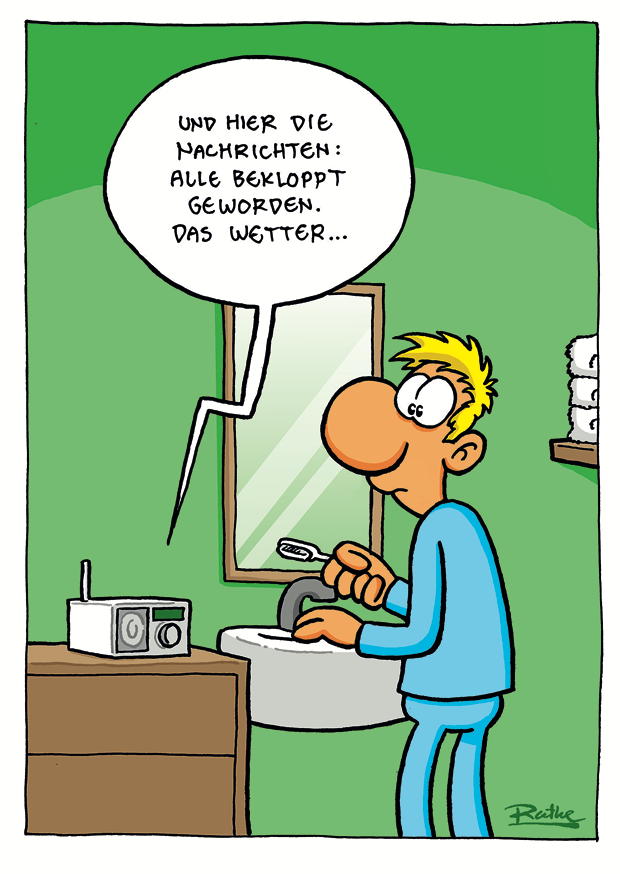 Ein Mann in Schlafanzug steht vor dem Spiegel im Badezimmer und hört mit Interesse die Nachrichten, die vom Radio kommen, während er sich rasiert.