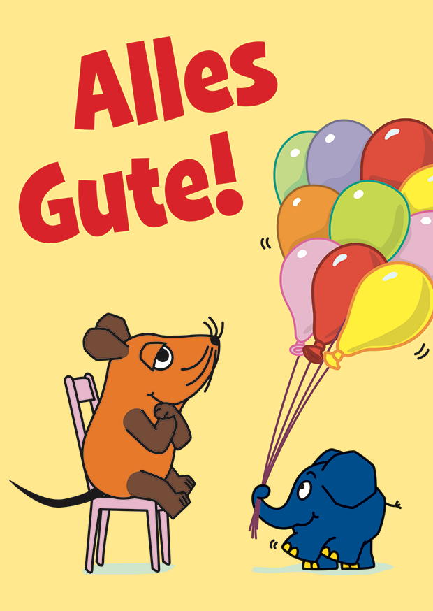 Die Maus schaut neugierig auf den blauen Elefanten, der fröhlich mit einer Vielzahl von bunten Ballons gute Wünsche überbringt. Es ist eine festliche Stimmung.