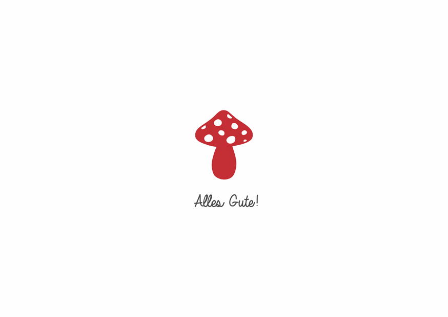 Ein roter Pilz mit weißen Punkten wird auf einem klaren, weißen Hintergrund abgebildet, zusammen mit dem Schriftzug „Alles Gute“ unterhalb des Pilzes.