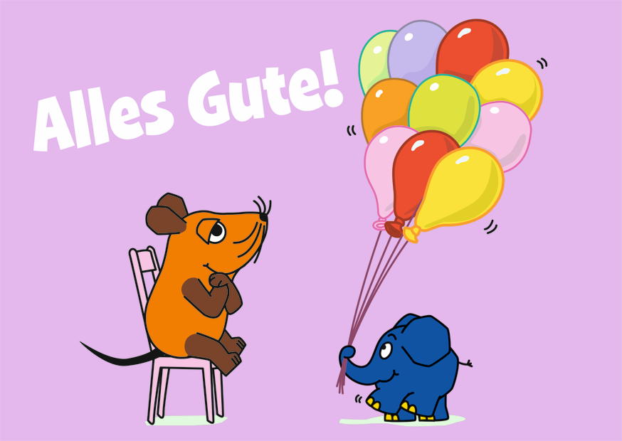 Eine fröhliche Maus sitzt auf einem Stuhl und beobachtet einen kleinen Elefanten, der farbige Ballons hält. Die Szene strahlt Freude und Feierlichkeit aus.