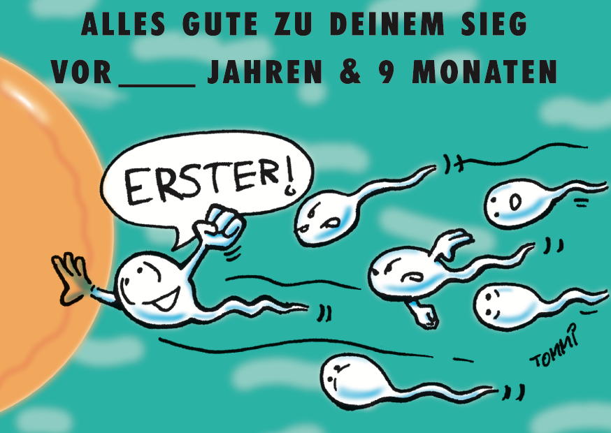Ein witziger Glückwunsch, der den Moment feiert, als der erste Spermium erfolgreich zur Eizelle gelangt ist. Ein kreatives Bild mit einem erfreuten Charakter.