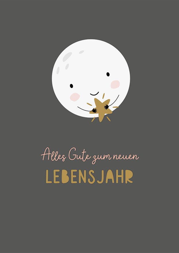 Ein niedlicher Mond mit einem Lächeln hält einen goldenen Stern, um Freude und Glück zum neuen Lebensjahr zu bringen. Perfekt für Geburtstagsglückwünsche.