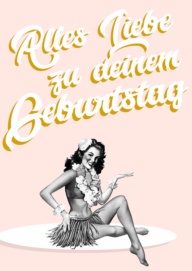 Diese Geburtstagskarte zeigt eine Retro-Darstellung einer Tänzerin in einem Hula-Rock. Sie strahlt Freude aus und ist umgeben von einem luftigen, pastellfarbenen Hintergrund.