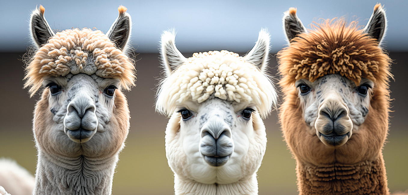 Drei Alpakas stehen nebeneinander und schauen aufmerksam in die Kamera. Ihre verschiedenen Farben und das sanfte Licht des Tages schaffen eine entspannte Atmosphäre auf der Wiese.