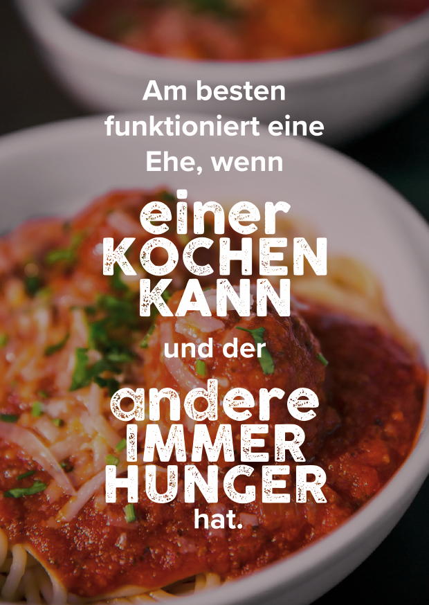 Eine witzige Aussage über die Ehe zeigt, wie wichtig es ist, dass einer kochen kann und der andere immer hungrig bleibt. Spaghetti mit Tomatensauce veranschaulichen dies köstlich.
