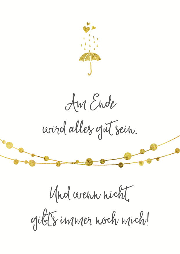 Ein motivierendes Zitat, das Optimismus fördert und Hoffnung gibt. Die goldenen Wassertropfen und der Regenschirm tragen zur positiven Botschaft bei.