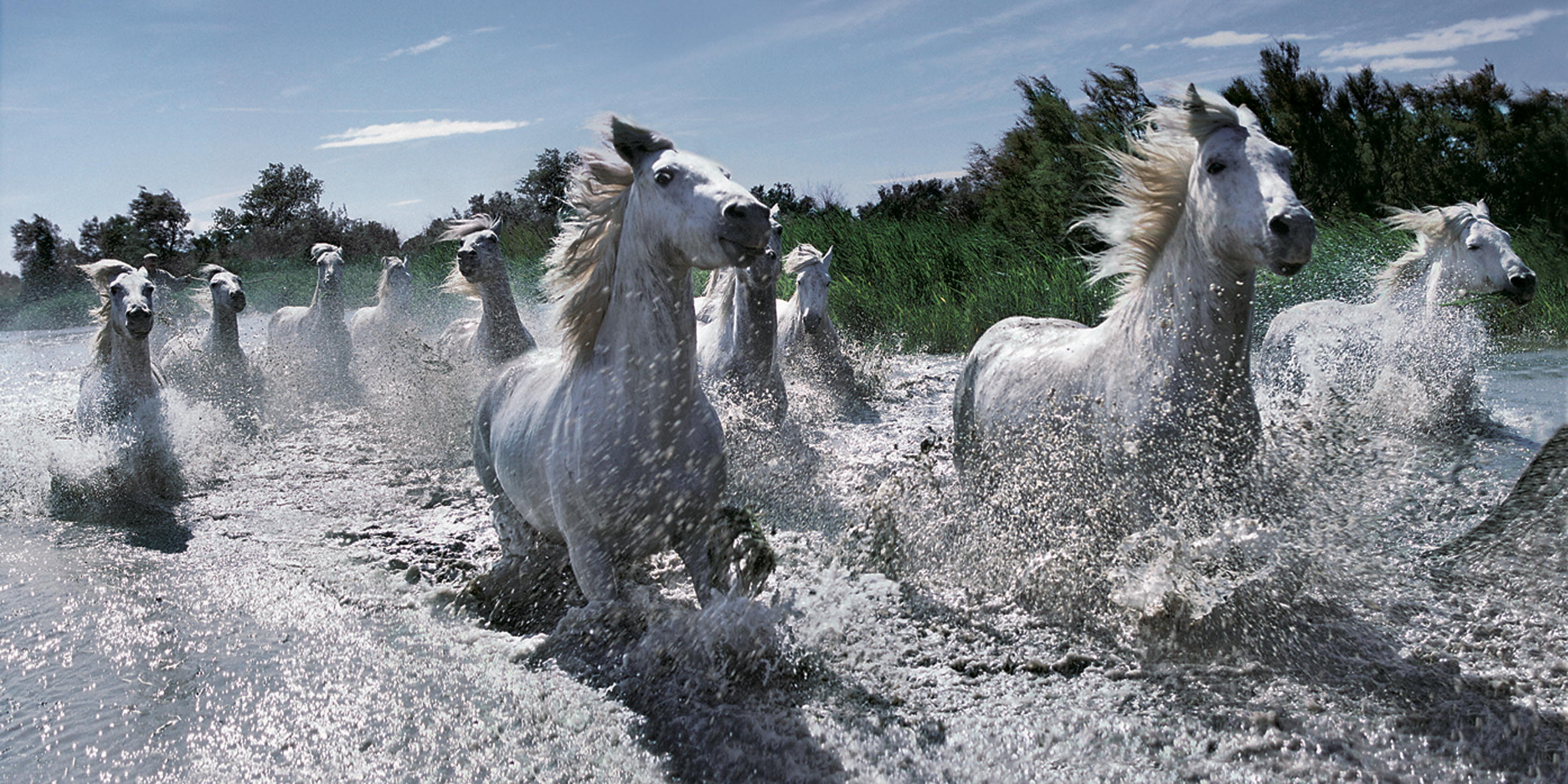 Eine Gruppe weißer Pferde galoppiert in einem Wasserlauf und spritzt Wasser um sich. Die Tiere zeigen ihre majestätische Schönheit in der Natur.