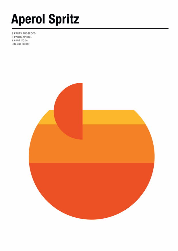 Dieses Design zeigt die Zutaten für einen Aperol Spritz. Es umfasst die Zubereitungsdetails in einer klaren und modernen Anordnung, die die Zutaten farblich hervorhebt.