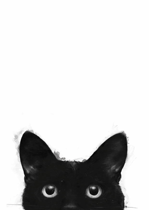 Eine schwarze Katze hebt ihren Kopf, um neugierig über einen weißen Hintergrund zu blicken. Die großen, runden Augen ziehen Aufmerksamkeit auf sich.