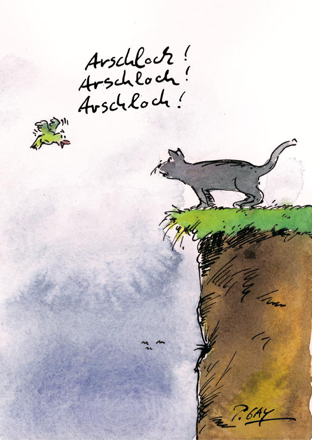 Ein schwarzer Kater steht am Rand eines Abgrunds und schaut auf einen Vogel, den er beleidigend anruft. Die humorvolle Situation spielt draußen in der Natur.