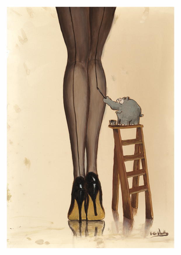 Ein kleiner Elefant balanciert auf einer Leiter und versucht, mit einem Pinsel die Beine einer stilvollen Frau zu bemalen, die hohe Absätze trägt.