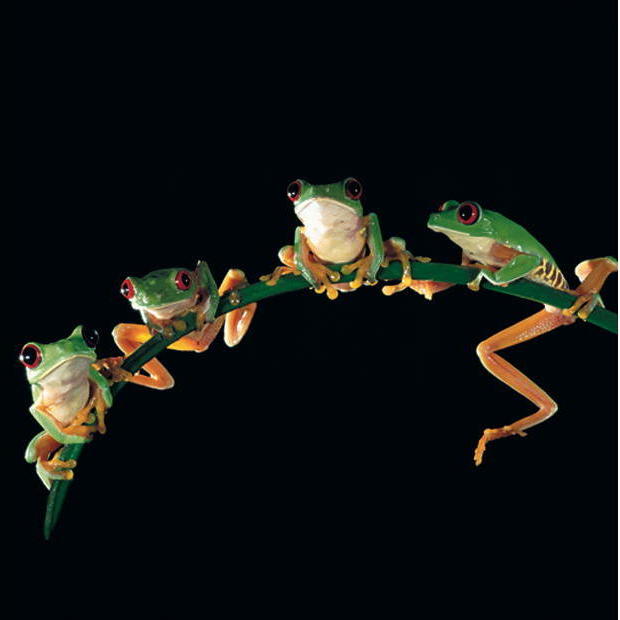 Vier lebhafte Frösche mit roten Augen ruhen auf einem Ast und schaffen eine harmonische Darstellung der Tierwelt inmitten der Dunkelheit.
