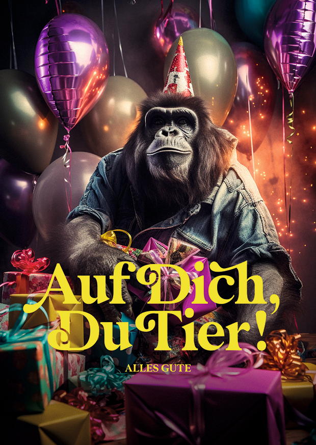 Ein Gorilla trägt einen Partyhut und sitzt entspannt zwischen bunten Geschenken und Luftballons auf einer Geburtstagsfeier, die lebhaft dekoriert ist.