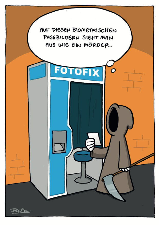 Ein Sensenmann steht vor einer Fotobox und betrachtet ein Passbild. Er äußert, dass die Fotos oft unheimlich wirken und wie ein Mörder aussehen.