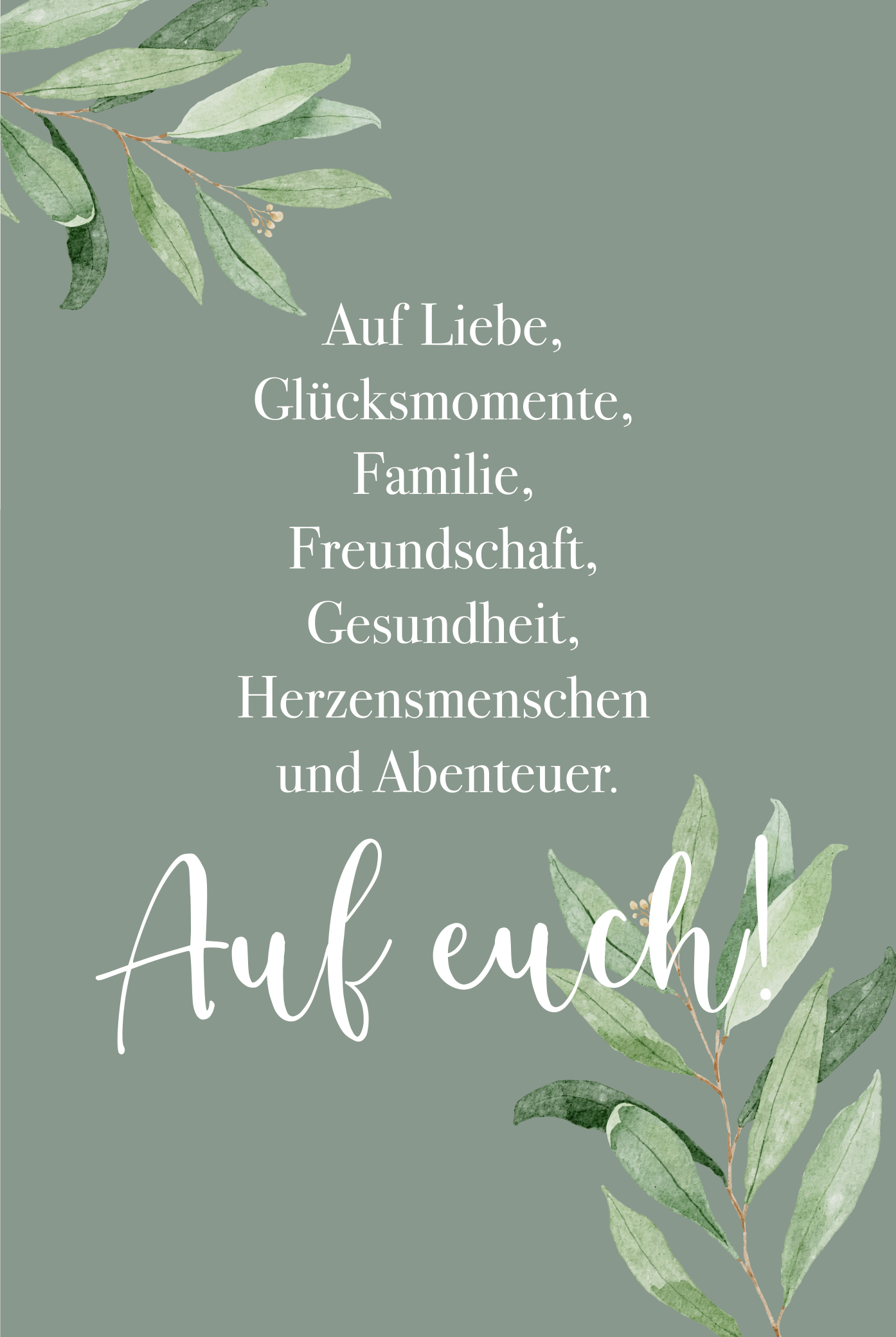 Ein schönes Zitat, das Werte wie Liebe, Glücksmomente und Abenteuer feiert, umgeben von eleganten Pflanzenmotiven. Perfekt für besondere Feierlichkeiten.