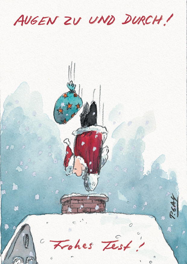 Ein Weihnachtsmann hängt kopfüber mit einem Geschenkesack in einem Kamin. Der Schnee bedeckt das Dach, und die festliche Stimmung ist spürbar.