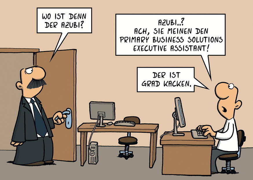 In einem Büro unterhält sich ein Vorgesetzter mit einem Mitarbeiter über den Lernenden, der sich im Moment nicht an seinem Platz befindet.