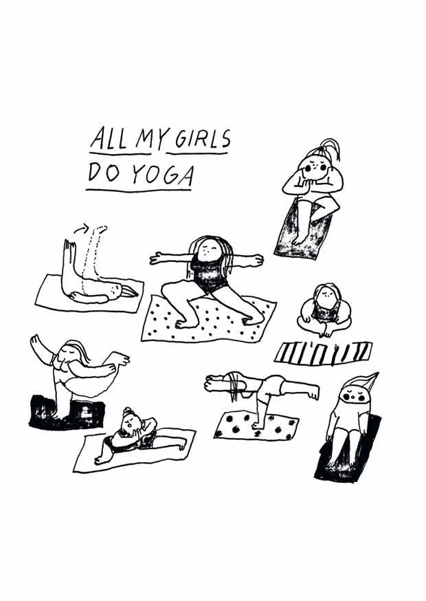 Eine Gruppe von Mädchen praktiziert Yoga in verschiedenen Positionen auf ihren Matten. Die Darstellung zeigt Freude und Gemeinschaft. Es ist eine entspannende Freizeitaktivität.
