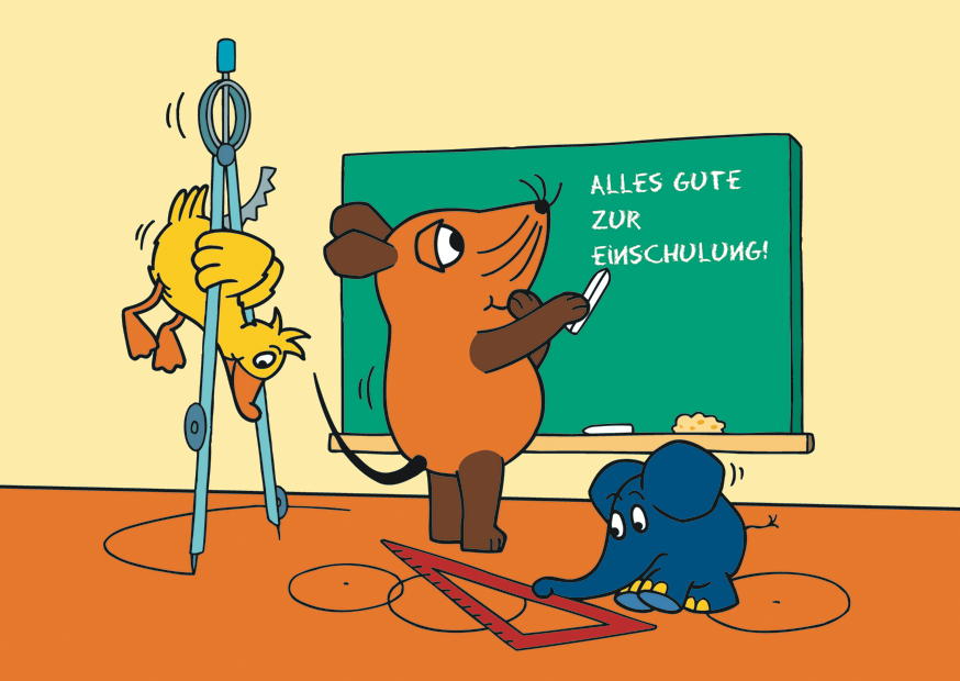 Eine Maus schreibt an einer Tafel und wünscht alles Gute zur Einschulung, während ein Elefant und ein Vogel helfen und sich einbringen.