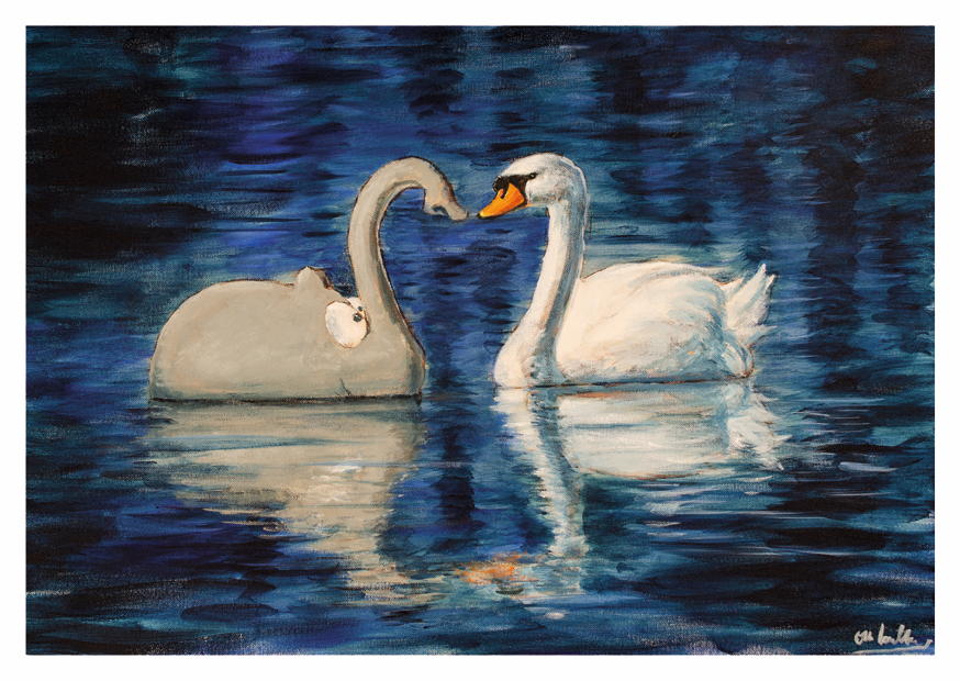 Zwei Schwäne schwimmen sanft auf einem ruhigen Gewässer. Ihre Köpfe sind zärtlich zueinander geneigt, während die Umgebung in sanften Blautönen schimmert.