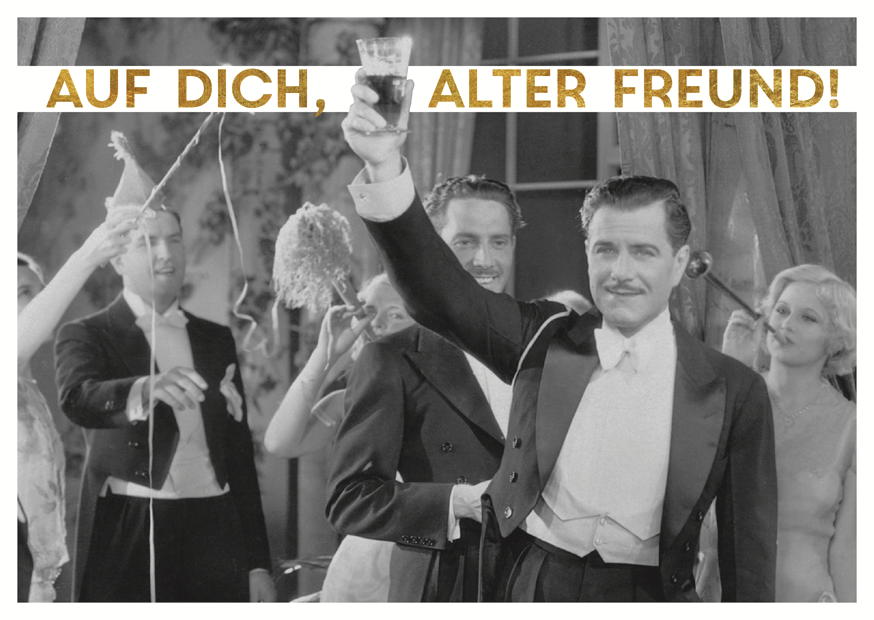Eine Gruppe von elegant gekleideten Personen feiert zusammen und stößt mit Gläsern an, während sie fröhlich miteinander kommunizieren und eine ausgelassene Stimmung genießen.