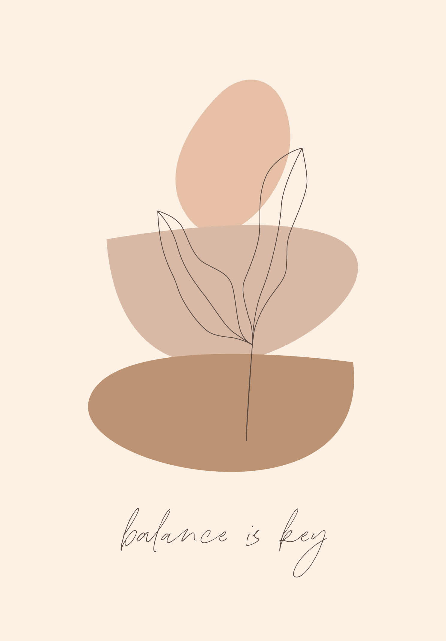 Eine stilvolle abstrakte Darstellung zeigt eine Pflanze, die zwischen verschiedenen geometrischen Formen in sanften, erdigen Farben positioniert ist und Balance symbolisiert.