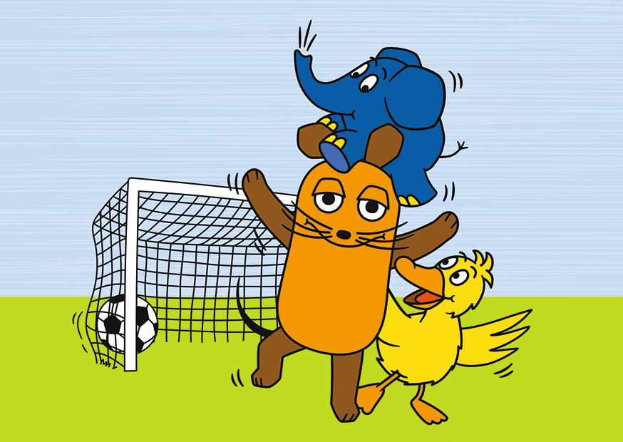 Eine Maus steht im Mittelpunkt und hält einen blauen Elefanten auf ihrem Rücken, während eine gelbe Ente fröhlich daneben posiert. Sie haben Spaß bei ihrem Fußballspiel.