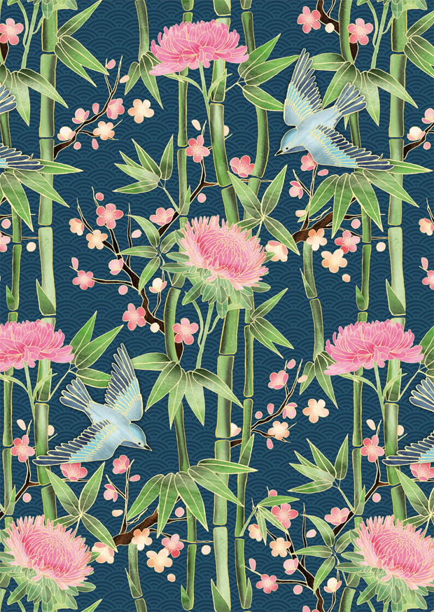 Ein lebhaftes und detailliertes Muster zeigt verschiedene Vögel, pinkfarbene Blumen und grüne Bambuszweige vor einem tiefblauen Hintergrund.