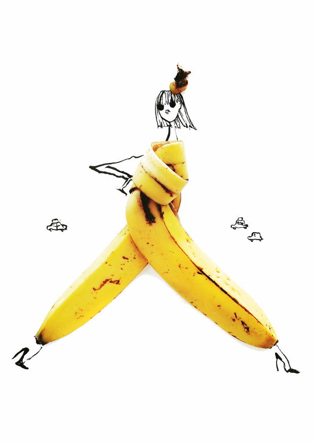 In dieser farbenfrohen Kreation wird eine Frau dargestellt, die aus zwei miteinander verbundenen Bananen besteht. Der fröhliche Ausdruck vermittelt eine Stimmung von Lebensfreude und Erneuerung.