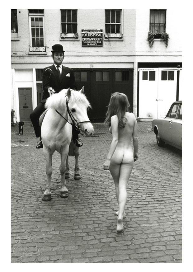 In einer alten Stadtgasse der 1960er Jahre reitet ein Mann auf einem weißen Pferd, während eine nackte Frau in seine Richtung geht. Die Atmosphäre ist ungewöhnlich und auffällig.