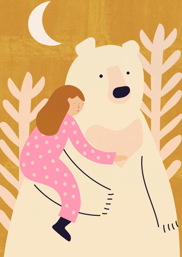 Ein fröhliches Mädchen in einem gepunkteten Schlafanzug umarmt einen freundlichen Bären. Der Halbmond und die bunten Pflanzen im Hintergrund schaffen eine warme Atmosphäre.