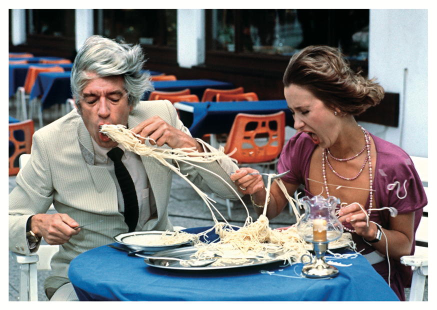 Ein Mann und eine Frau sitzen an einem Tisch im Freien und genießen das Essen von Spaghetti. Beide wirken begeistert und haben Spaß beim Essen in einem Restaurant.