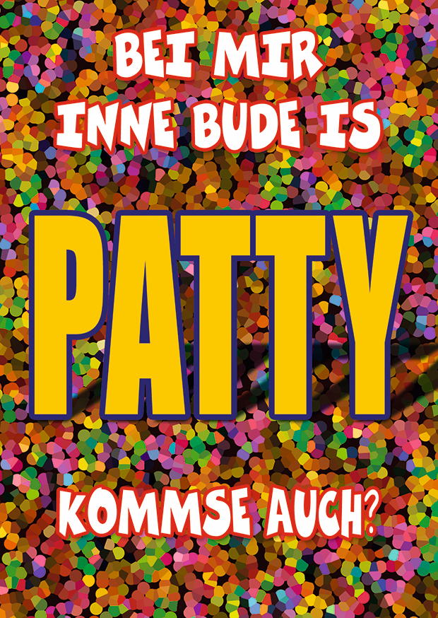 In einer bunten Umgebung wird zur Feier von Patty eingeladen. Die animierende Frage, ob jeder teilnehmen möchte, sorgt für Vorfreude auf das bevorstehende Event.