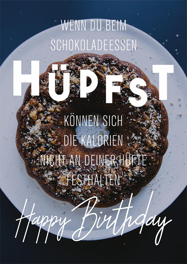Auf einer dekorativen Tafel steht eine reichhaltige Schokoladentorte mit einer festlichen Botschaft. Das Gebäck ermuntert, die Kalorien zu vergessen und zu feiern.