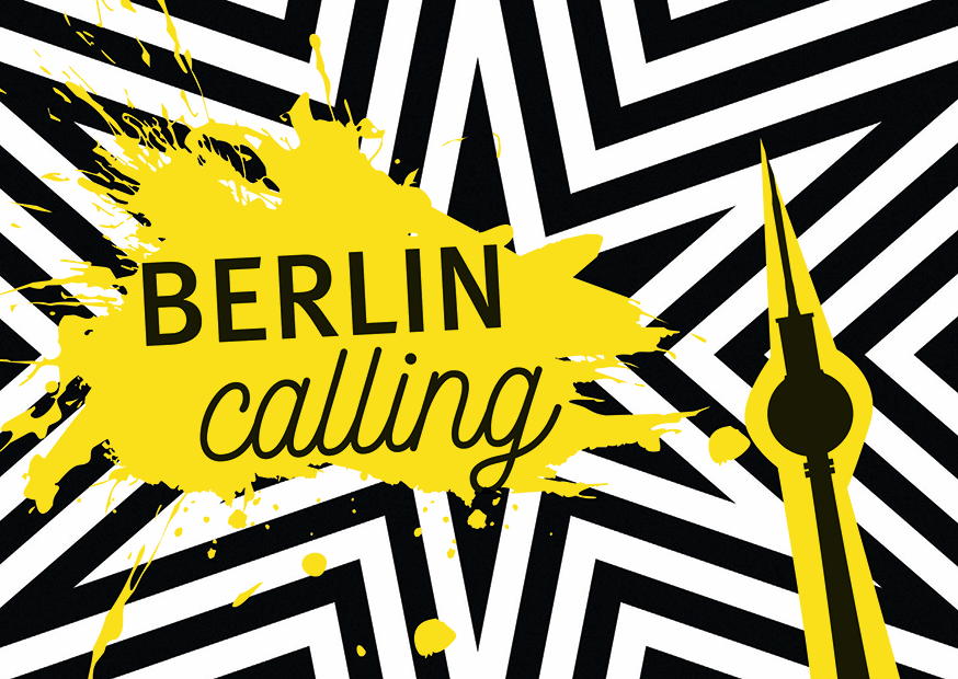 Das Poster präsentiert den Schriftzug „Berlin calling“ in einem auffälligen Gelbton, umgeben von einem grafischen Schwarz-Weiß-Muster und der Silhouette des Fernsehturms von Berlin.