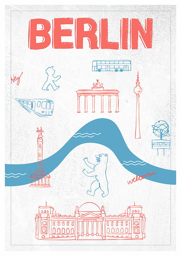 Die Grafik zeigt eine kreative Zusammenstellung berühmter Berliner Sehenswürdigkeiten, darunter das Brandenburger Tor und den Fernsehturm, umgeben von stilisierten Illustrationen.