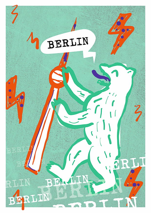 Der Bär steht symbolisch für Berlin und interagiert mit einer bekannten Landmarke, während lebendige Farben und Grafikelemente die Kreativität betonen.
