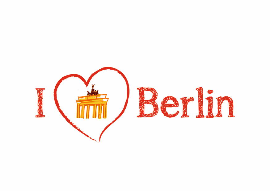 Ein grafisches Design zeigt eine Herzform mit dem Brandenburger Tor im Inneren, das die Liebe zur Stadt Berlin ausdrückt und deren kulturelle Bedeutung hervorhebt.